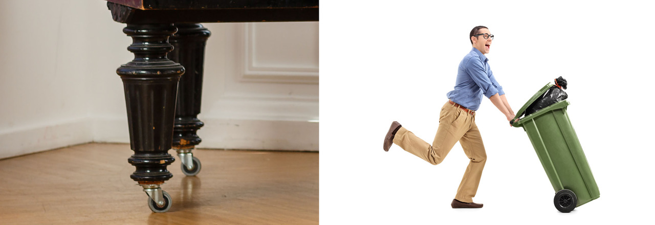 Pyöriä kannattaa lisätä monenlaisiin esineisiin. Piano ja keräysastia.