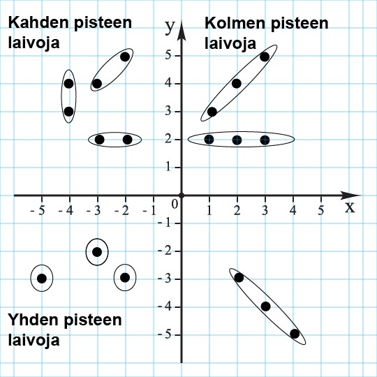 Kumpikin pareista tekee vihkoon kaksi koordinaatistoa, 5 x 5 koordinaatistot. Toiseen koordinaatistoon merkitään omat "laivat" siten, että yksi laiva on kolmen pisteen kokoinen, kaksi laivaa kahden pisteen kokoisia ja kolme laivaa yhden pisteen kokoisia. Katso yllä oleva kuva, johon on sijoitettu esimerkkinä laivoja.