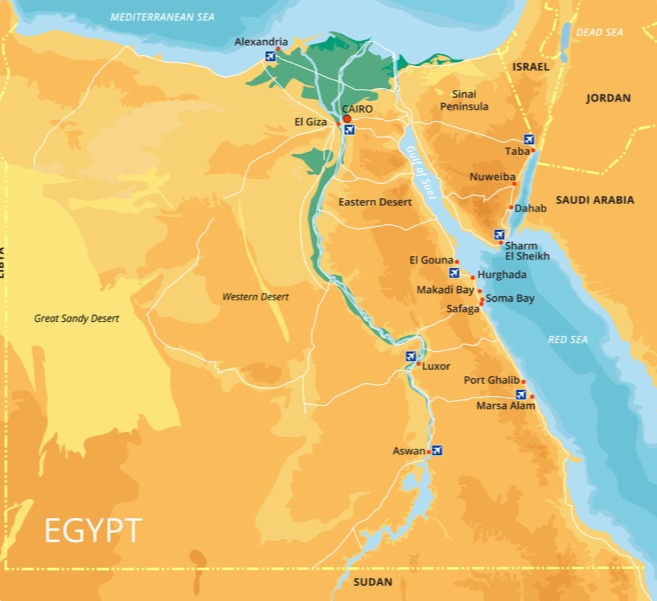 The capital city of Egypt is Cairo. It is located on the shores of the Nile. The Sinai Peninsula also belongs to Egypt. It is considered a part of the Asian continent.