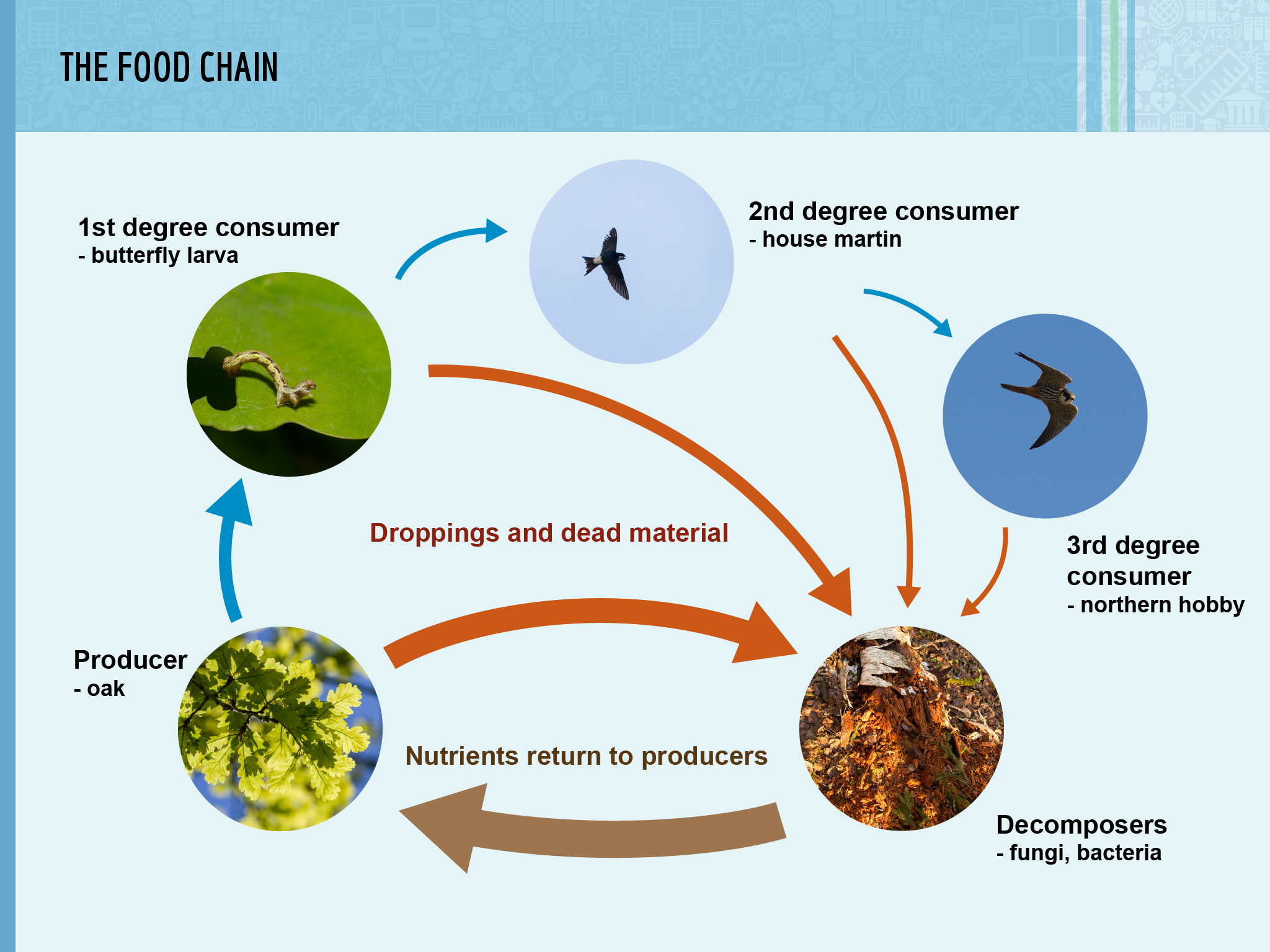 Jakaminen Sulje Energy flows through the food chain from the producer to consumers, and finally to decomposers. Pysyvä osoite https://peda.net/id/29646206f8d Pysyvä tiedoston latausosoite https://peda.net/id/29646206f8d:file/download/b07f7f0a33b68bfb55b7252d23740c7d80a32f00/food-chain-slide.png Jakaminen muihin palveluihin Share this page to Facebook QR-koodi