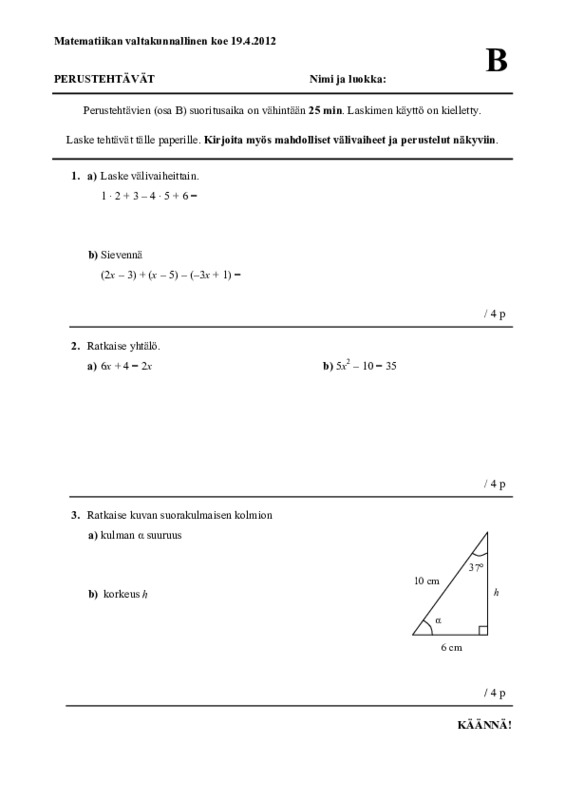Tiistaina vuorossa vuoden 2012 valtakunnallisen kokeen B-osa. Tämä osio on tarkoitus tehdä ilman laskinta.