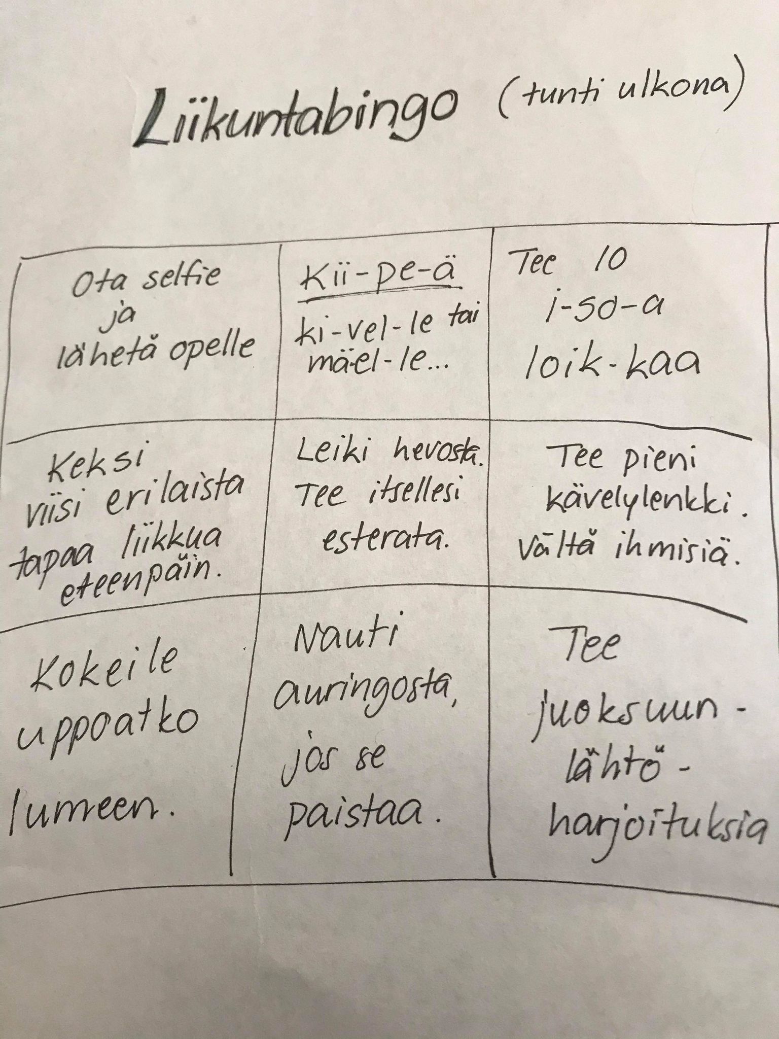 Jakaminen Sulje Liikuntabingo Pysyvä osoite https://peda.net/id/6228179e811 Pysyvä tiedoston latausosoite https://peda.net/id/6228179e811:file/download/0b727f5cd53df5a00d253d88a37da74d175bb609/liikuntabingo.jpg Jakaminen muihin palveluihin Share this page to Facebook QR-koodi