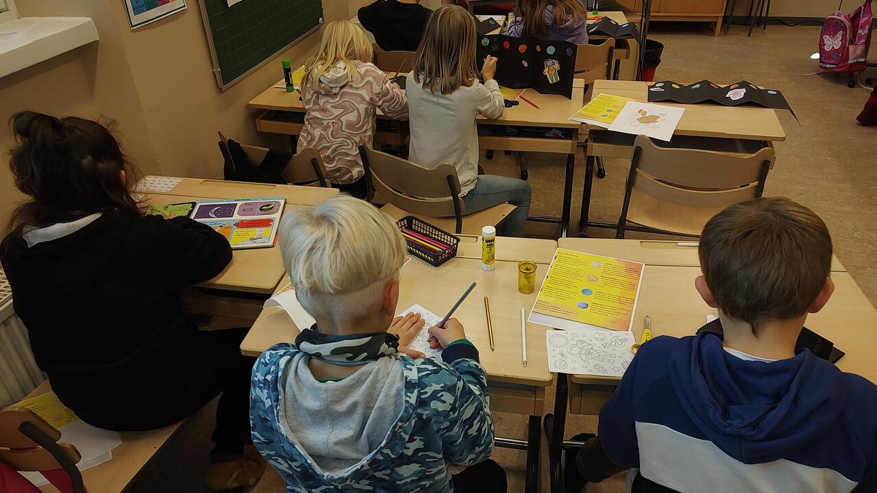 Harjoitellaan avaruussanastoa englanniksi, erityisesti planeettojen nimiä. Kuunnellaan ja lauletaan englanninkielisiä lapsille suunnattuja avaruuslaulua. Kuvataiteessa tehdään avaruusaiheinen työ sekatekniikalla (vesivärimaalaus, vahaliidut)