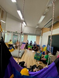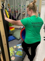 Koulutus tarjosi konkreettisia keinoja, teoriaa ja välineiden kokeilua sensorisen integraation näkökulmasta inspiroivassa ympäristössä Erityismuksut Oy:n SI-terapiaan suunnitelluissa tiloissa.