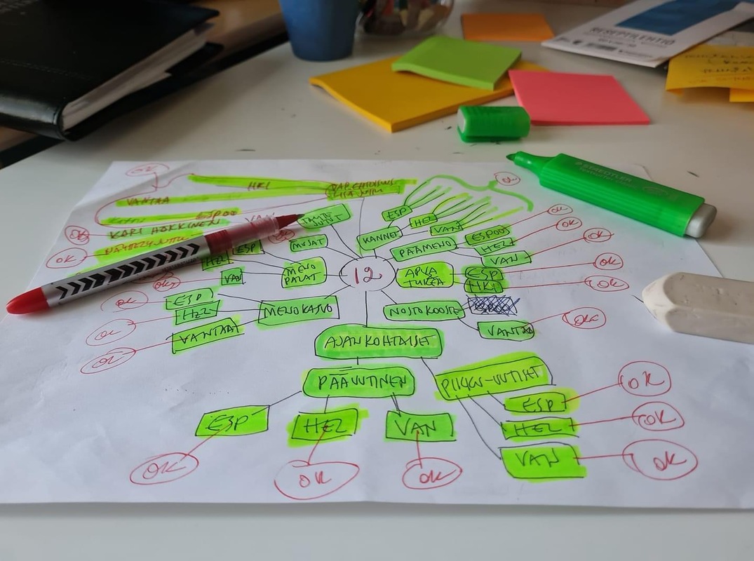 En tulisi toimeen ilman Mindmappia eli ajatuskarttaa! Kuvassa on siitä hyvä esimerkki. Merkkaan tämmöiseen aaneloseen eri juttujen vaiheet: Onko juttu odottamassa editointia? Ovatko kuvat saapuneet? Puuttuvatko kuvatekstit? Onko juttu oikoluettu ja korjattu? Entä verkkoversio? Kuka hoitaa videon editoinnin?