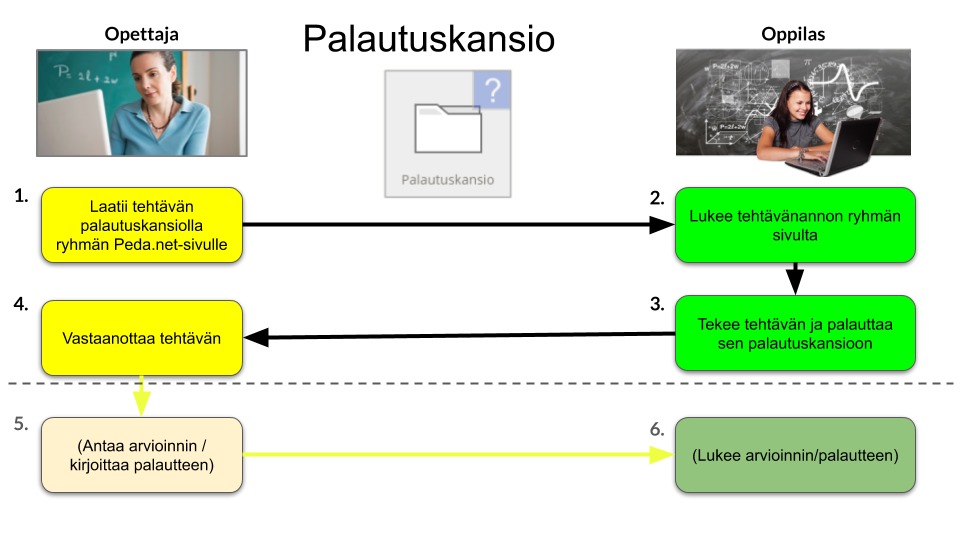 Palautuskansio mahdollistaa kaksisuuntaisen kommunikaation oppilaan ja opettajan välillä ao. kuvan mukaisesti.