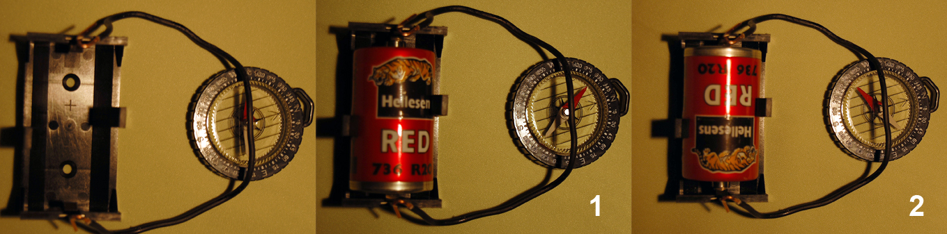 Kompassin neula asetetaan johtimen suuntaiseksi. Kun paristo kytketään, kääntyy neula poikittain johtimeen. Kun paristo käännetään, kääntyy myös neula.