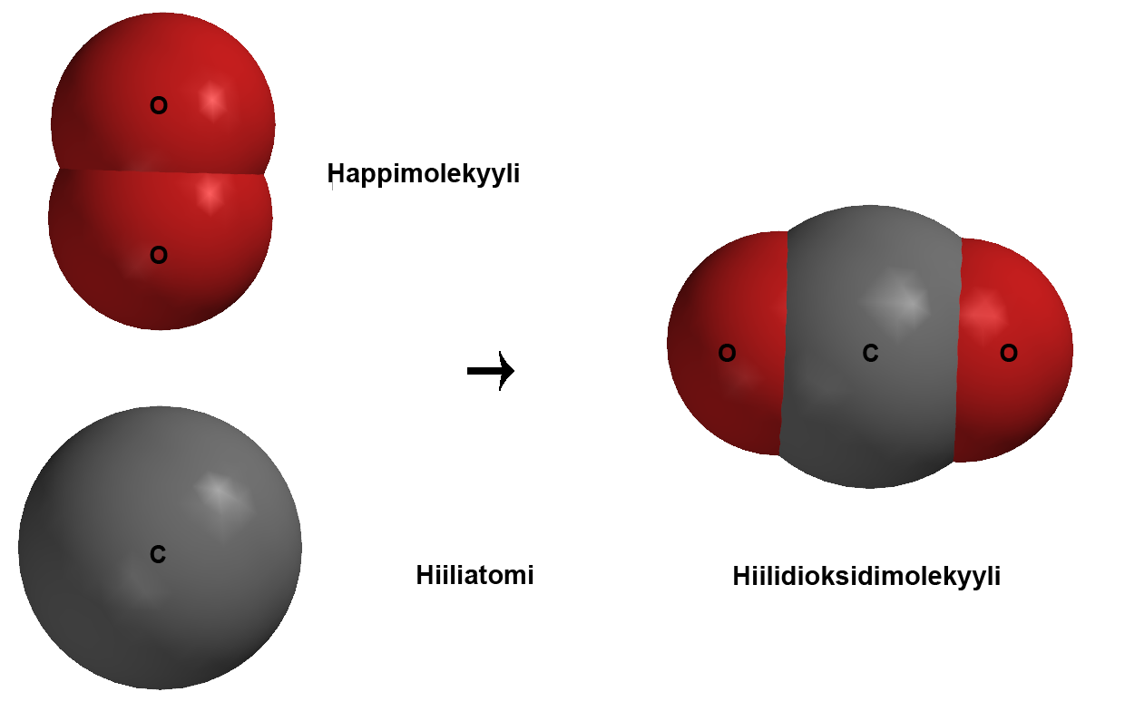 Jakaminen Sulje Kemiallisessa reaktiossa atomeista syntyy uusia aineita, joita kutsutaan yhdisteiksi. Kun happiatomit yhdistyvät hiiliatomiin, syntyy hiilidioksidia. Hiilidioksidi on yhdiste, jossa on kaksi happiatomia. Se on palanutta hiiltä. Joskus yhteen hiiliatomiin voi yhdistyä vain yksi happiatomi. Näin syntyy hiilimonoksidia eli häkää. Se on vaarallista. Pysyvä osoite https://peda.net/id/GQGHnL Pysyvä tiedoston latausosoite https://peda.net/id/GQGHnL:file/download/f31ecf0f30ec0a1f4ec1c631755d9bff351df32e/hiili-happi-hiilidioksidi-EO.png Jakaminen muihin palveluihin Share this page to Facebook QR-koodi