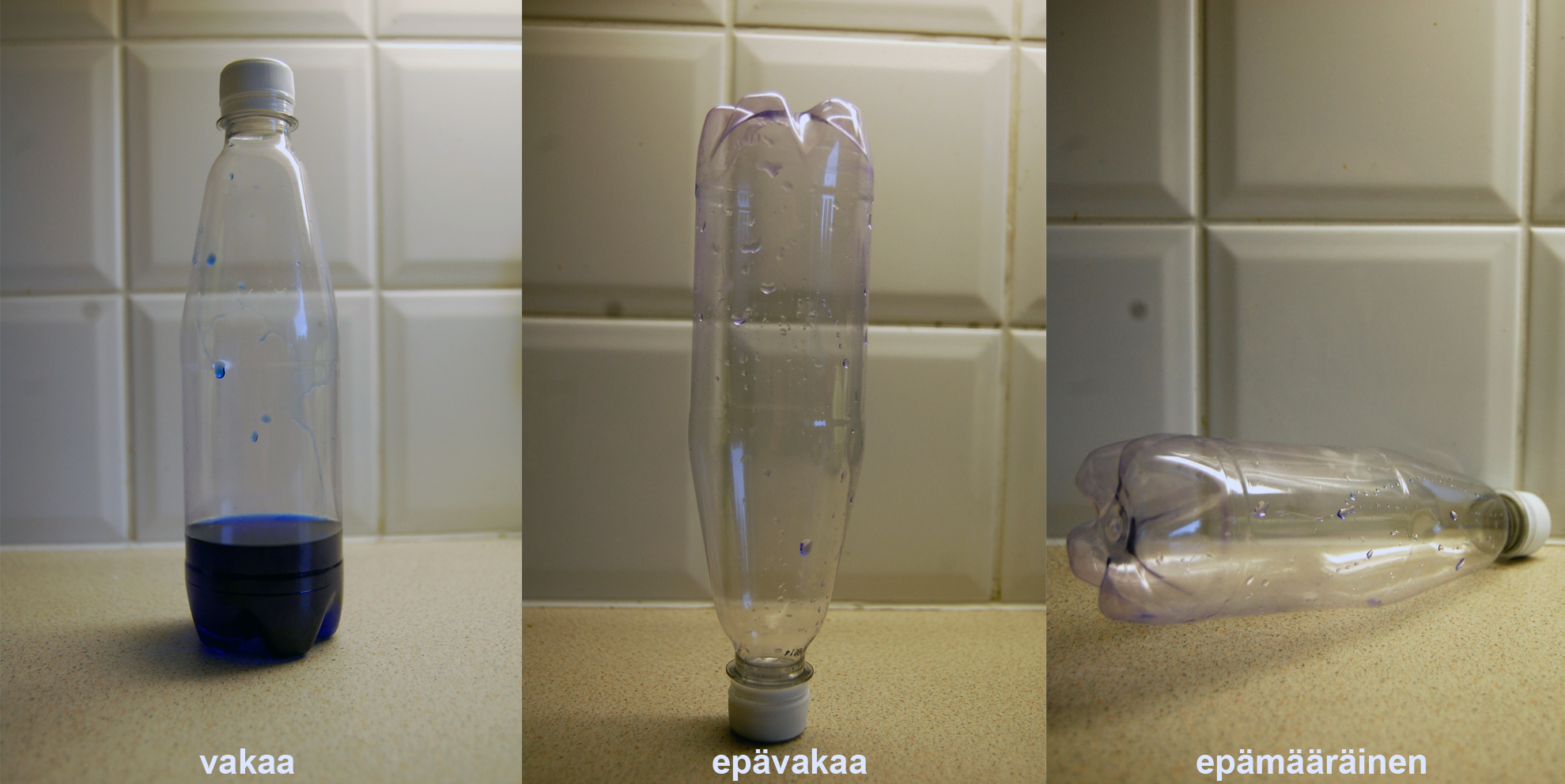 Jakaminen Sulje Vasemmalla olevan pullon tasapaino on varsin vakaa, sillä se ei pienestä tönäisystä kaadu. Keskimmäisen pullon tasapaino on horjuva, sillä se kaatuu pienestäkin tönäisystä. Oikealla oleva pullo saattaa epämääräisesti joko palata tönäisyn jälkeen ennalleen tai sitten ei. Pysyvä osoite https://peda.net/id/TrF3M Pysyvä tiedoston latausosoite https://peda.net/id/TrF3M:file/download/652817a986b1e2bcc3147681946072e4a7bd226e/vakaa_epavakaa_epam.jpg Jakaminen muihin palveluihin Share this page to Facebook QR-koodi