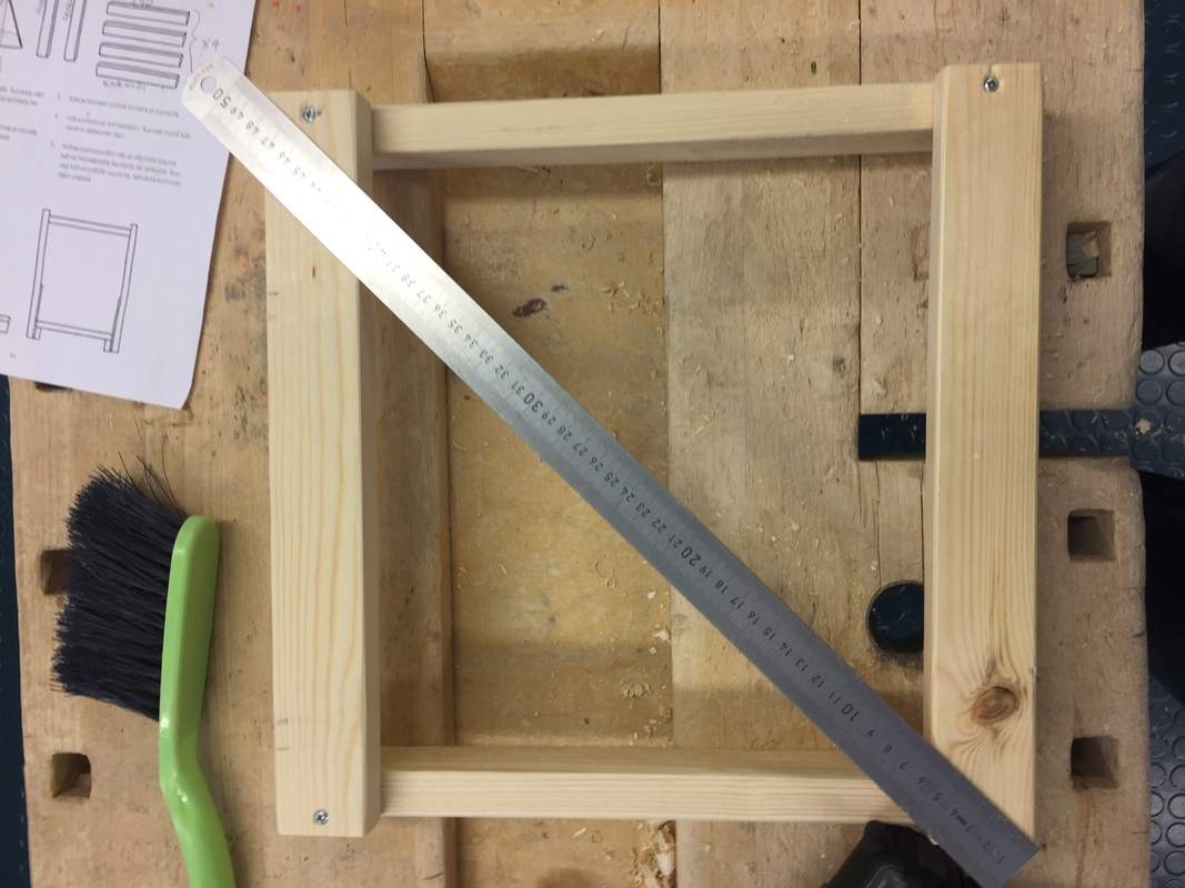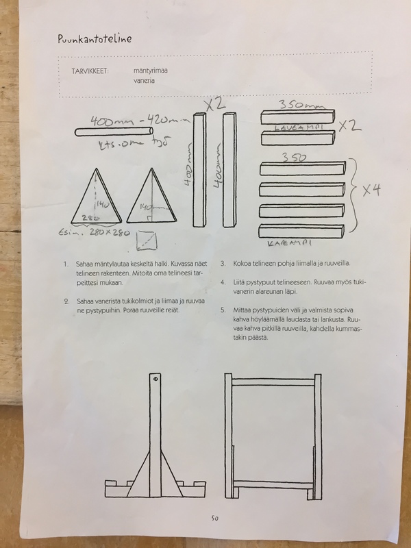 Mittoja hieman muuteltu. Esim. kaikki osat on tehty sahaamalla leveä lauta kolmeen osaan. Tukikolmio on työssäni 200 x 200 neliöstä sahattu.