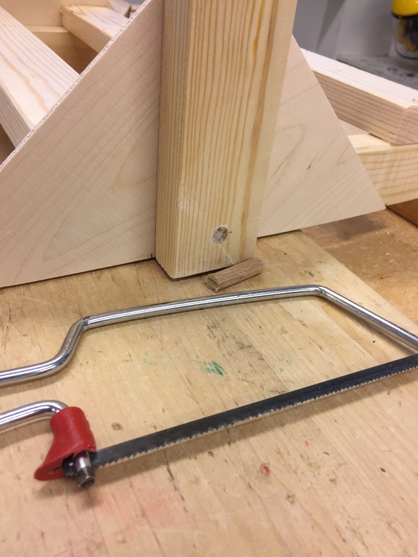 Tässä pystypuun kiinnitys. Jätä puutappi hieman pitkäksi ja sahaa ylimääräinen osa pois. Viimeistele hiomalla.