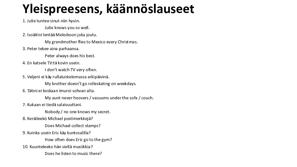 Yleispreesens, käännöslauseet.pdf Jaa Sulje Tämän tiedoston tekstivastine: (tyhjä tekstivastine) Yleispreesens, käännöslauseet.pdf 177.2 kt