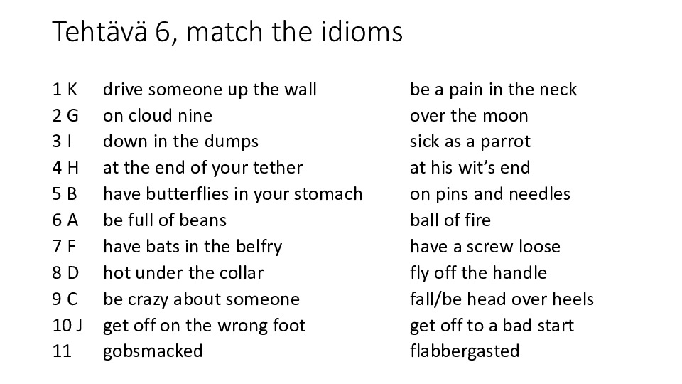 Tehtävä 6, match the idioms.pdf Jaa Sulje Tämän tiedoston tekstivastine: (tyhjä tekstivastine) Tehtävä 6, match the idioms.pdf 87.5 kt