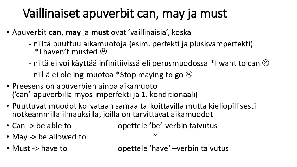 Vaillinaiset apuverbit can, may ja must.pdf Jaa Sulje Tämän tiedoston tekstivastine: (tyhjä tekstivastine) Vaillinaiset apuverbit can, may ja must.pdf 974.6 kt