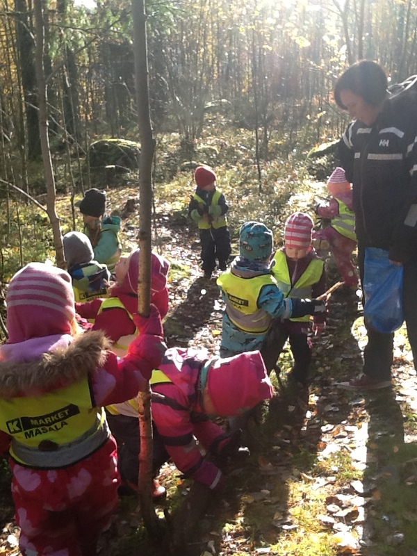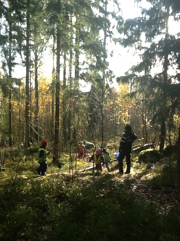 Från och med nästa vecka tar vi inte mera matsäck till skogen. Vädret har blivit så kallt och då vi måste ta handskarna bort när vi äter vår matsäck blir barnen så kalla om fingrarna. Dessutom tar det längre tid för oss att komma iväg till skogen, då vi nu behöver mera kläder. På detta sätt får vi mera tid på oss att utforska skogen.