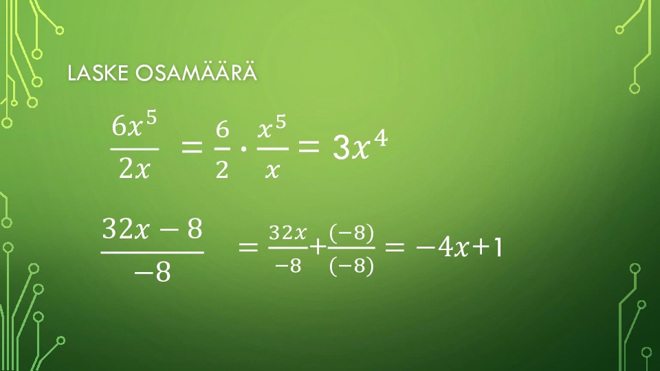 Polynomien jakaminen monomilla Video: Tehtävät: Perustaso: TK s.45 LT8 s.89 499-500 Taitaja: LT8 s.89 501-504 Mestari: LT8 s.89 505-506, syvennä s. 208