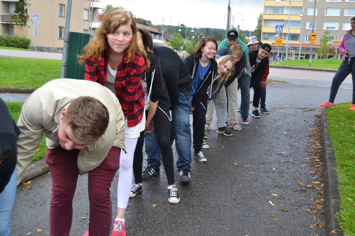 Annoimme opiskelijoille narun, että he pitivät siitä kävellessä kiinni, kuin oikeat ekaluokkalaiset. Meillä oli kyltti mukana jossa luki "keltanokat liikenteessä". Vastaantulijoilta tuli katseita ja hymyä. Ensimmäisen vuoden opiskelijat heittäytyivät yllättävän hyvin mukaan .