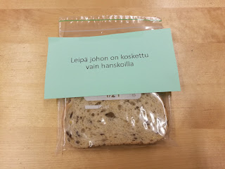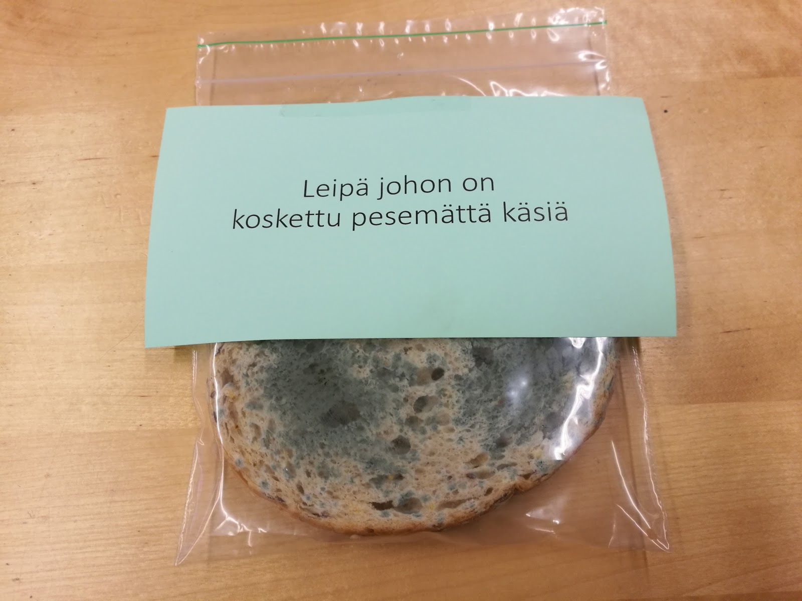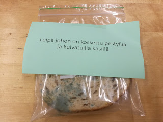 Tässä demonstroidaan leipäpalojen avulla käsipesun tärkeyttä. Aluksi oli 4 leipäpalaa, ja kuvien lapuista näet, miten niitä käsiteltiin. Leivät laitettiin muovipusseihin. Ensin ei tapahtunut paljon mitään. Viikkoa myöhemmin tulokset olivat kauhistuttavan selkeät.
