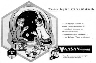 Vaasan leipämainos vuodelta 1958 Jaa Sulje Tämän kuvan tekstivastine: (tyhjä tekstivastine) Vaasan_lapset_avaruusmatkalla_1958.jpg 29.5 kt Kommentit Kirjaudu sisään lisätäksesi tähän kommentin
