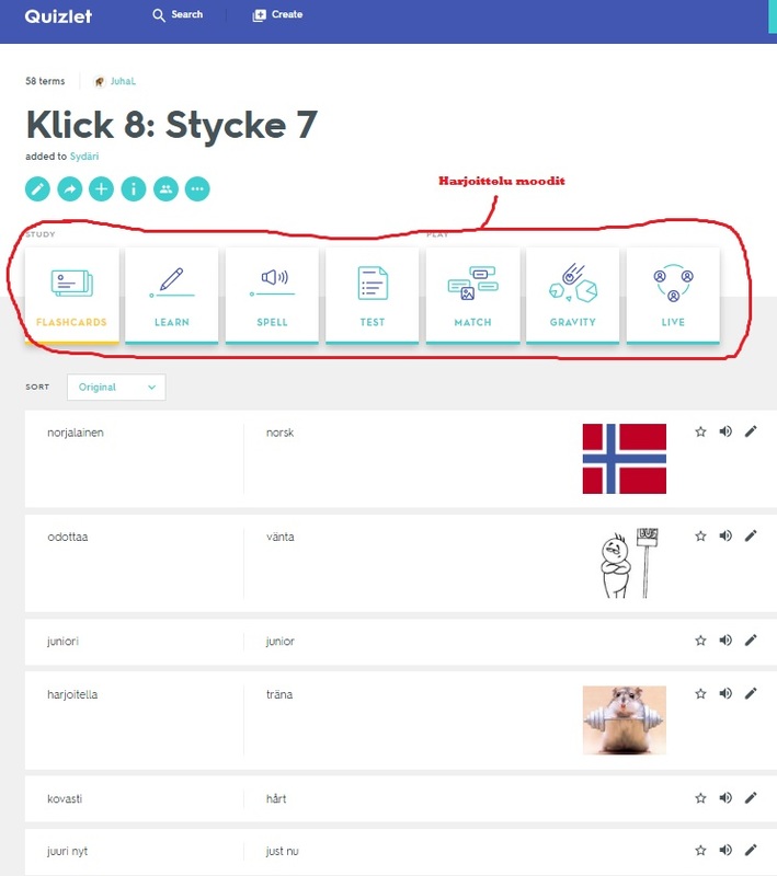 - Quizlet on sana- tai vastinepareihin perustuva pelialusta, jonne voi luoda omia ”study settejä”. Seteistä Quizlet luo nopeasti erilaisia harjoituspelejä tai kokeen.