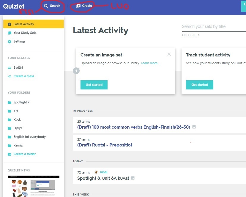 4. Olet valmis aloittamaan Quizletin käytön. Luo uusia tehtäviä (create) tai käytä Quizletin muiden käyttäjien luomia tehtäviä (search).