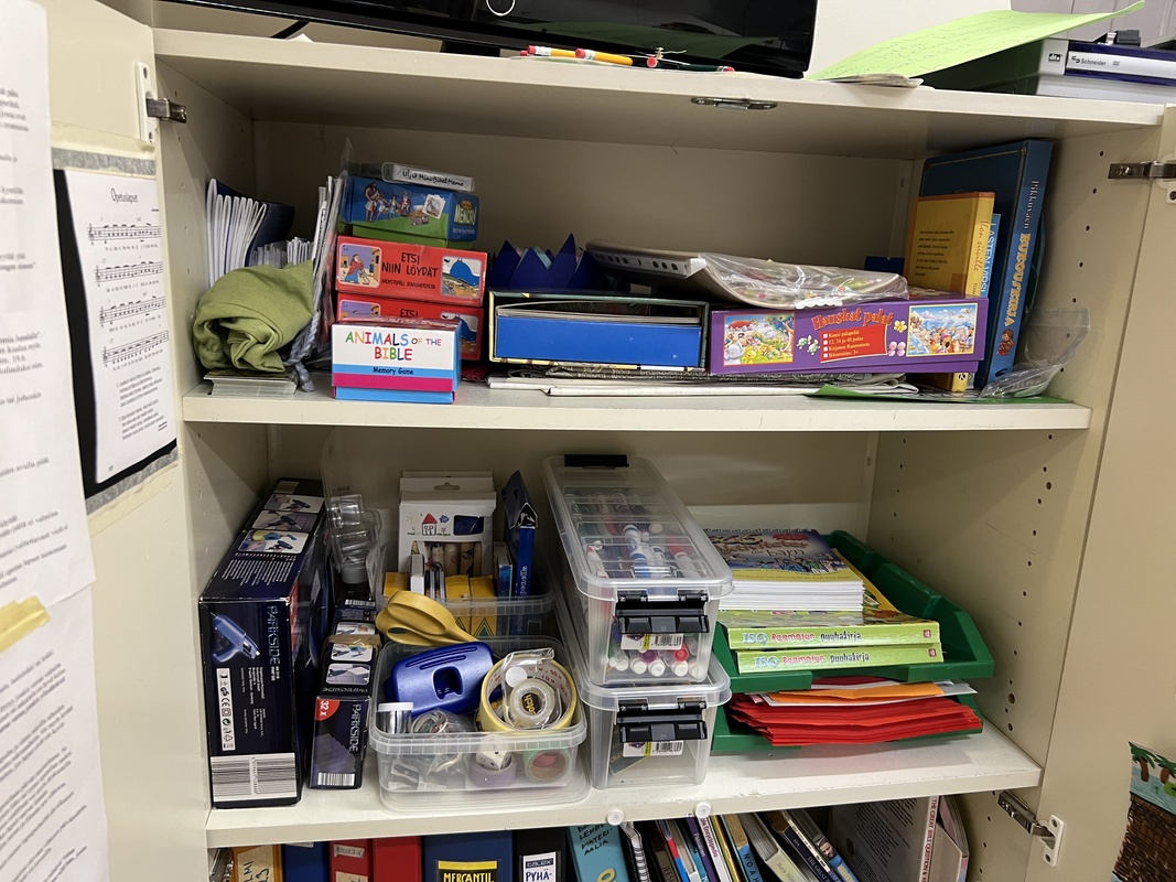 Vanhan pyhäkoulukaapin ylimmät hyllyt