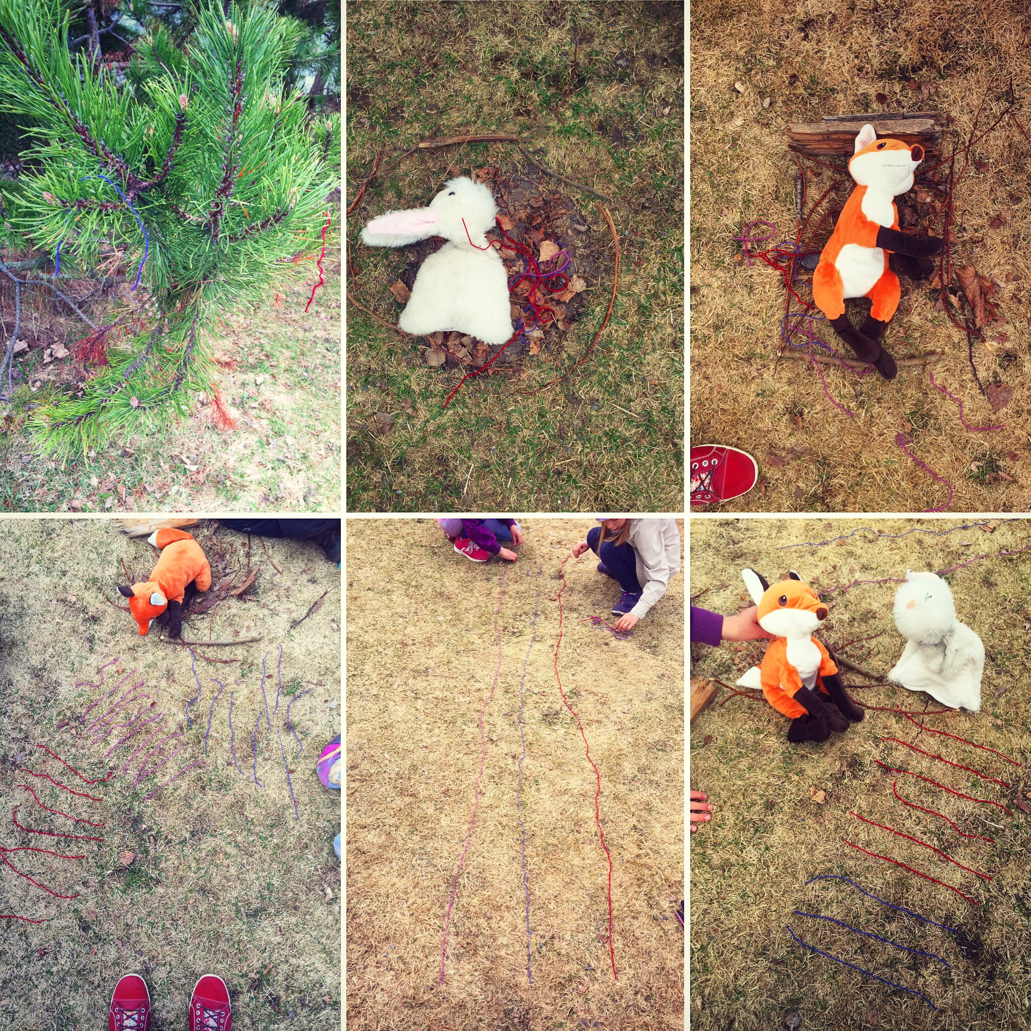 Eskareiden kanssa ulkomatikkaa! Ensin jaettiin porukka ryhmiin ja kukin ryhmä rakensi eläimellensä joko kolmion, neliön tai ympyrän muotoisen pesän luonnonmateriaaleista, sitten etsittiin erivärisiä "matoja" pihapuista ja pensaista, ja tuotiin ne yksi kerrallaan pesään. Tämän jälkeen "madot" lajiteltiin värin mukaan, ja laskettiin pisteet. (Isommilla olen toteuttanut saman niin että erivärisistä madoista on saanut aina eri määrän pisteitä.) Sitten enemmän-vähemmän -käsitteillä vertailua. Vielä langat laitettiin jonoon, ja vertailtiin mikä väri oli pisin, mikä lyhin. Lopuksi yksinkertaisia yhteen- ja vähennyslaskuja, kun pupu tuli ketun luokse päivälliselle ja toi matoja ja sitten söivät niitä!