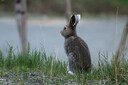 Metsäjänis (Lepus timidus) talvipuvussa keväisessä maastossa.