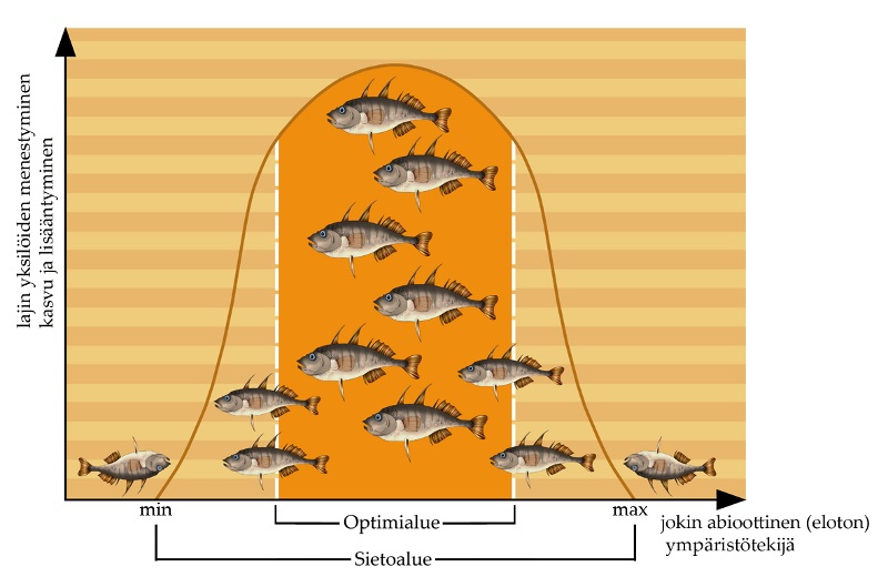 Sietoalue ja optimialue. Sietoalueella lajin yksilöt pystyvät elämään. Optimialueella ne lisääntyvät parhaiten ja säilyvät pisimpään hengissä.