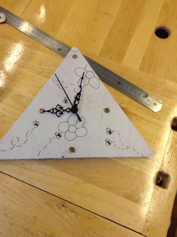 käytimme työssämme puuta ja maalia hiekkkaa viisareitä.