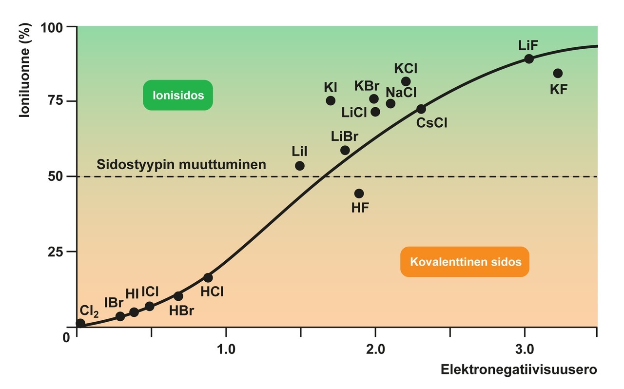 - Kun kahden atomin välinen elektronegatiivisuusero kasvaa suureksi, elektronegatiivisempi atomeista voi viedä sidoselektronin kokonaan itselleen.