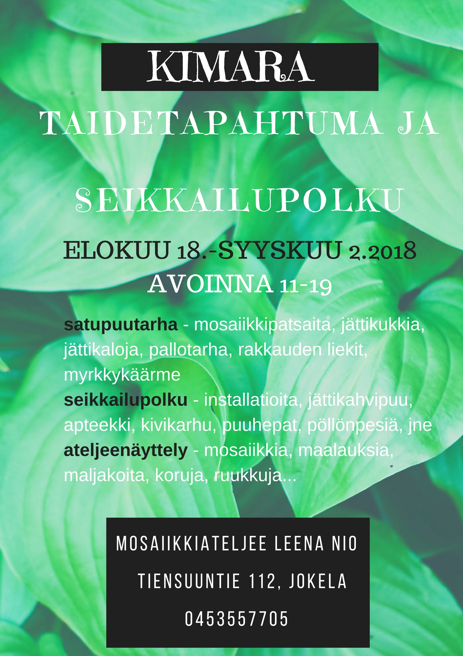 Jakaminen Sulje Kesänäyttely Jokelassa Leena Nio Mosaiikkiateljee Pysyvä osoite https://peda.net/id/aefdf0b03ee Pysyvä tiedoston latausosoite https://peda.net/id/aefdf0b03ee:file/download/982b7b1bb25e40c7f429e44e93e82637e4d744e2/KIMARA-4.jpg Jakaminen muihin palveluihin Share this page to Facebook QR-koodi