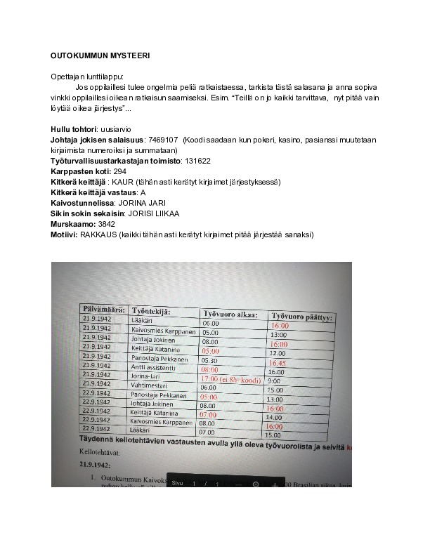 Outokummun mysteeri harjoituttaa monipuolisesti laaja-alaisia taitoja, erityisesti ryhmässä ratkottuna. Pelin aikana käydään läpi mm. kemian, maantiedon, matematiikan sisältöjä, mutta laajimmin harjoitellaan yhteisöllistä ongelmanratkaisua ja yhteistyötaitoja, yhdistettynä monilukutaitoon ja tarkkaavaisuuteen. Tarinan teemana on rakkaus ja suhteet 1940-luvun kontekstissa. Pelin pelaaminen voi olla hyvä alku, useamman teeman käsittelylle yhdessä luokan kanssa. Antoisia pelihetkiä!