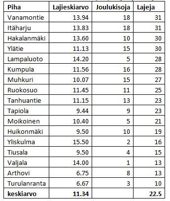 Kuva 1. Joulukisojen lajikeskiarvot.