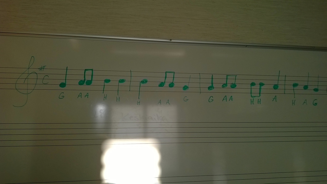Tehdään liikkeet ja toistetaan sanat yhtä aikaa yhteisessä rytmissä, taustalla tasajakoinen 4/4 musiikki.