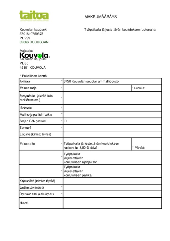 Ruokaraha-anomus (jos syö eväitä tai maksaa itse ruoan).pdf Jaa Sulje Tämän tiedoston tekstivastine: (tyhjä tekstivastine) Ruokaraha-anomus (jos syö eväitä tai maksaa itse ruoan).pdf 143.4 kt