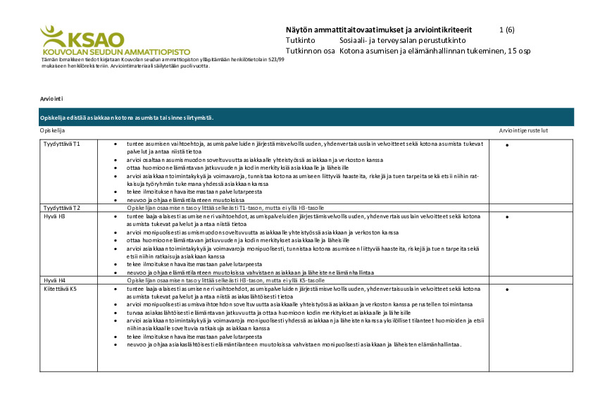 - käyttää alan työmenetelmiä, -välineitä ja materiaaleja kotona asumisen tukemisessa ja elämänhallinnan vahvistamisessa