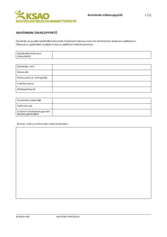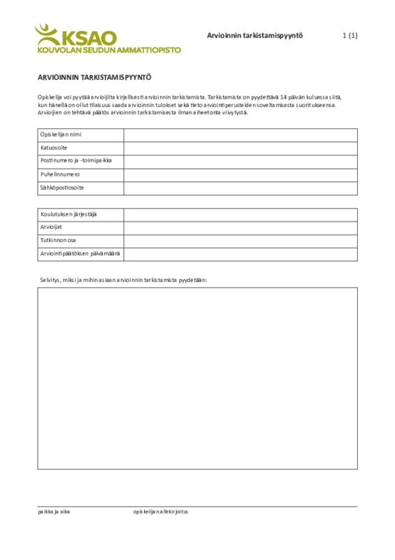 • Koulutuksen järjestäjä ohjaa tarvittaessa opiskelijaa arvioinnin tarkistamispyynnön tekemisessä (mm. kenelle toimitetaan kirjallisena ja vaadittavat perustelut).