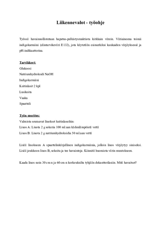 - Ymmärtää happo-emäsindikaattorin toimintaa (miksi väri vaihtuu liikennevaloliuoksessa)
