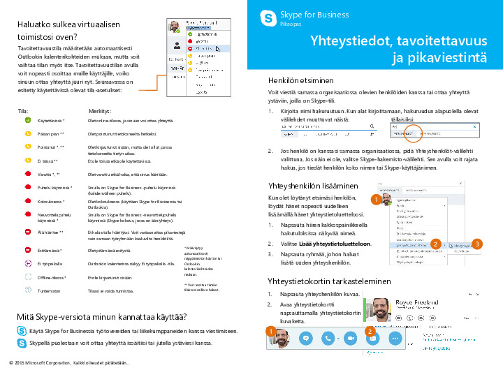 Ohjeita pikaviestien lähettämiseen, yhteystietojen käsittelyyn ja oman tavoitettavuustilan asettamiseen.