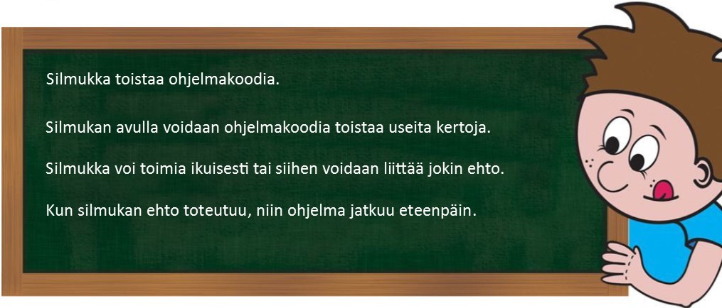 Tutustukaa erilaisiin silmukoihin, joita Scratch-ympäristössä käytetään. Selvittäkää, millaisia silmukoita ohjelmassa on käytettävissä, ja laatikaa ohjeet niiden käyttämiseen. Silmukat löytyvät valikosta ”ohjaus”. Osa silmukoista sisältää ehtoja, joita käsitellään seuraavassa tuntikokonaisuudessa. Näitä erilaisia ehtoja ei tarvitse tässä yhteydessä tutkia. Lisätietoja palikoiden ominaisuuksista saa englanniksi kysymysmerkkiä painamalla. Jakakaa laatimanne ohjeet muiden kommentoitavaksi. Korjatkaa ohjeita tarvittaessa palautteen perusteella.