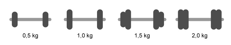 Pappa osti käsipainot. "Harjoittele sinä mummi noilla kahdella kevyimmillä painoilla, niin minä treenaan kahdella painavimmalla", pappa sanoi ja alkoi nostella puntteja. Kuinka paljon käsipainot painoivat yhteensä?