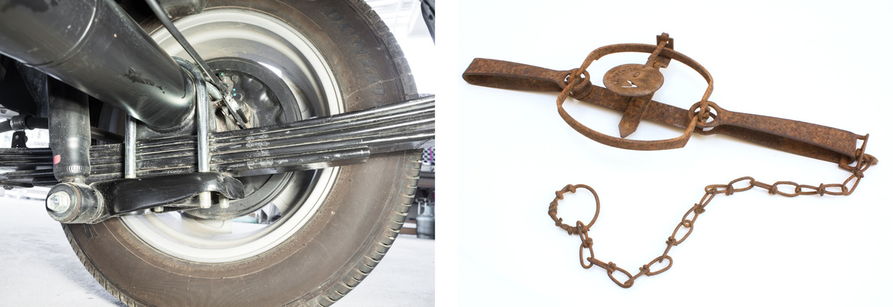 Image on the left: Leaf springs are used in vehicles and machinery. Image on the right: A hunting trap is based on two u-shaped leaf springs.