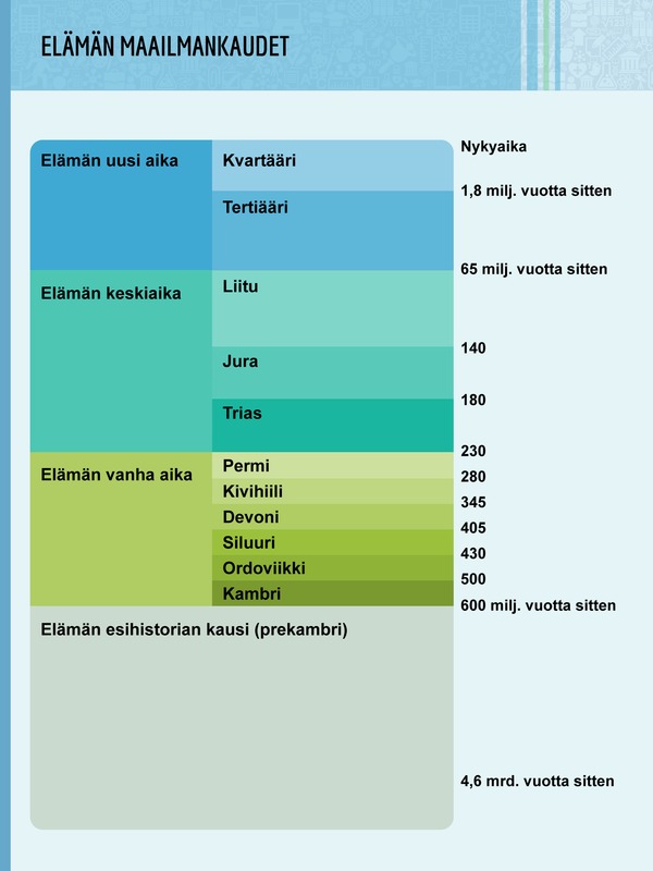 Jakaminen Sulje Maailmankaudet eivät jakaannu samanpituisiin kausiin: esimerkiksi elämän esiaika on lähes 50 kertaa pidempi ajanjakso kuin elämän uusi aika. Diagrammissa on esitetty suhteellinen maailmankausien pituus toisiinsa verrattuna sekä maailmankausien pituus miljoonina vuosina. Pysyvä osoite https://peda.net/id/d927eb157b0 Pysyvä tiedoston latausosoite https://peda.net/id/d927eb157b0:file/download/3ffc1564e152cb9753d055ddf74e7c342c939636/elaman-maailmakaudet-slide.png Jakaminen muihin palveluihin Share this page to Facebook QR-koodi