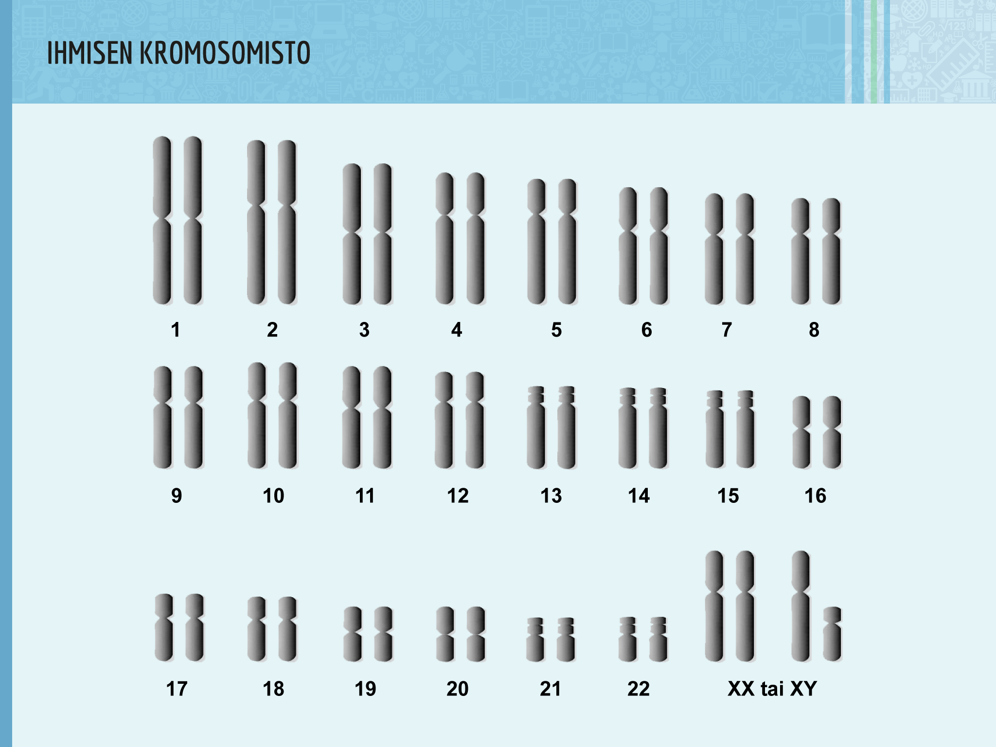 Jakaminen Sulje Ihmisen tavallisessa solussa on 46 kromosomia. X ja Y ovat ns. sukupuolikromosomeja. Pysyvä osoite https://peda.net/id/d99d04d77b0 Pysyvä tiedoston latausosoite https://peda.net/id/d99d04d77b0:file/download/1f17afb80fce195a634dc730473a0b16d05c1adb/ihmisen_kromosomisto-slide.png Jakaminen muihin palveluihin Share this page to Facebook QR-koodi