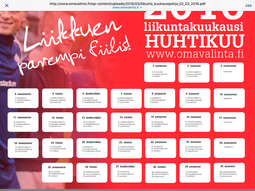 Jakaminen Sulje Liikuntahaasteen tehtävät Pysyvä osoite https://peda.net/id/789cef12f7e Pysyvä tiedoston latausosoite https://peda.net/id/789cef12f7e:file/download/70dfbe54542335827601a048372acf9033e65444/image.png Jakaminen muihin palveluihin Share this page to Facebook QR-koodi