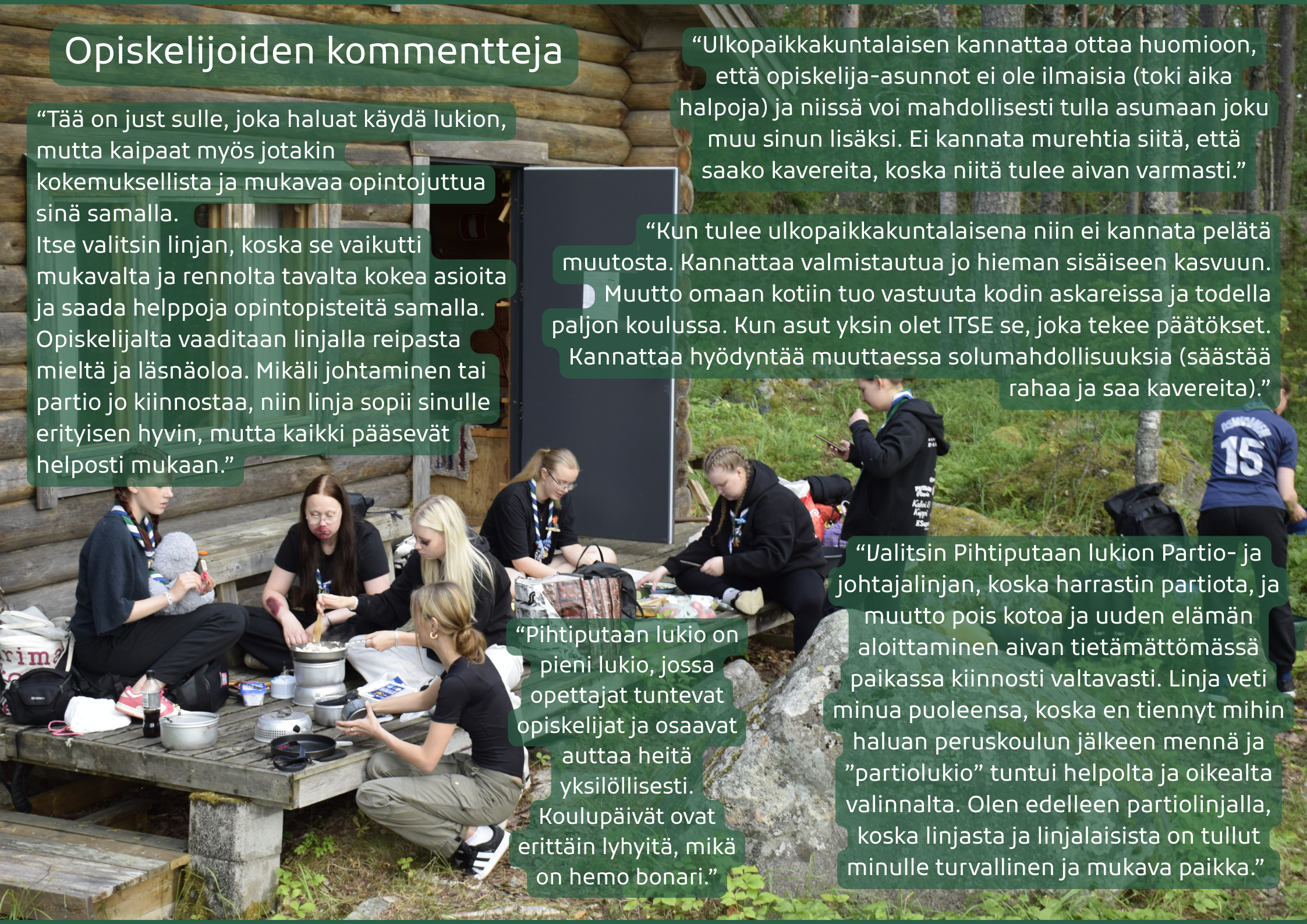 - ”Minulla on Pihtiputaan lukiosta vain positiivista sanottavaa. Halla on saanut tarvitsemaansa tukea oppimiseen, kuin myös psykososiaalista tukea. Opettajat ja muut koulun aikuiset todella pitävät huolta ja katsovat muualta tulleiden nuorten perään. Tämä on pienen koulun etu, opettajat ja muu henkilökunta tuntevat opiskelijat.