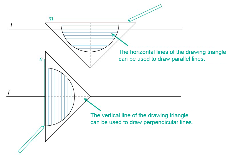 The horizontal lines of the drawing triangle can be used to draw parallel lines. The vertical line of the drawing triangle can be used to draw perpendicular lines. Jaa Sulje (c) e-Oppi Oy Tämän kuvan tekstivastine: (tyhjä tekstivastine) 2_drawing-triangle.png 75.3 kt