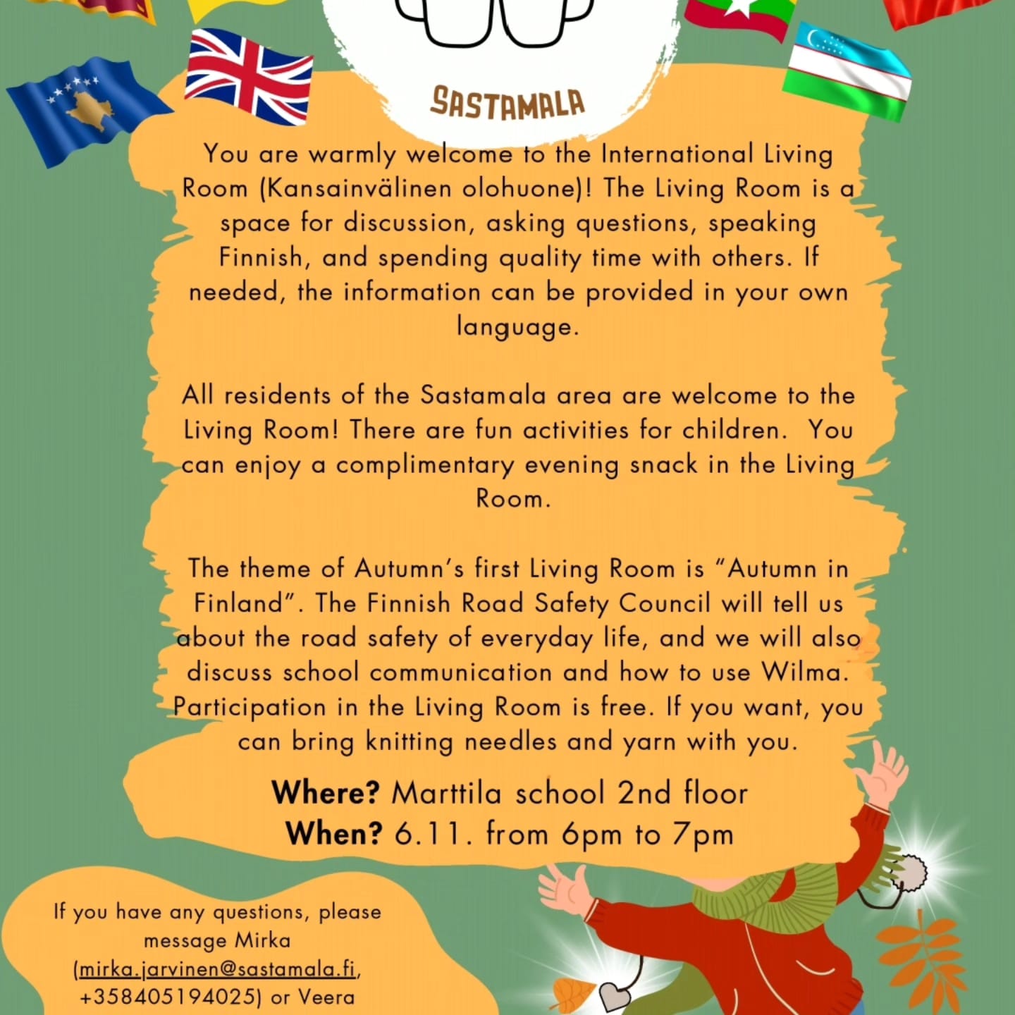 Tervetuloa kansainväliseen olohuoneeseen Marttilan koulun 2. kerrokseen 6.11. klo 18-19! Olohuoneessa on tarjolla ilapala ja se on tarkoitettu kaikille kaupunkilaisille.