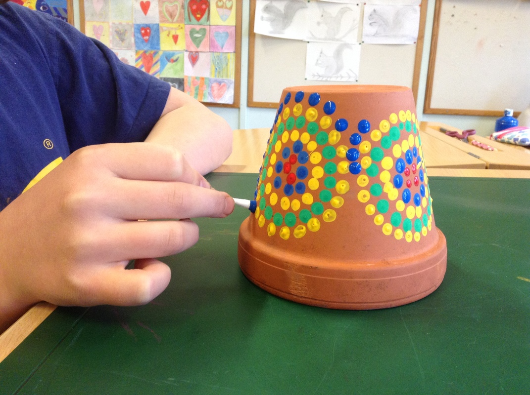 Pidä vanupuikko kohtisuorassa ruukkua vasten. Ympyrästä tulee näin tasainen. Kasta vanupuikkoa jokaisen töpötyksen jälkeen. Väristä tulee tasainen.